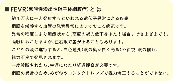検査が終わった後、医師から告げられたのは「FEVR(家族性滲出性硝子体網膜症)の可能性が高い」という診断でした。