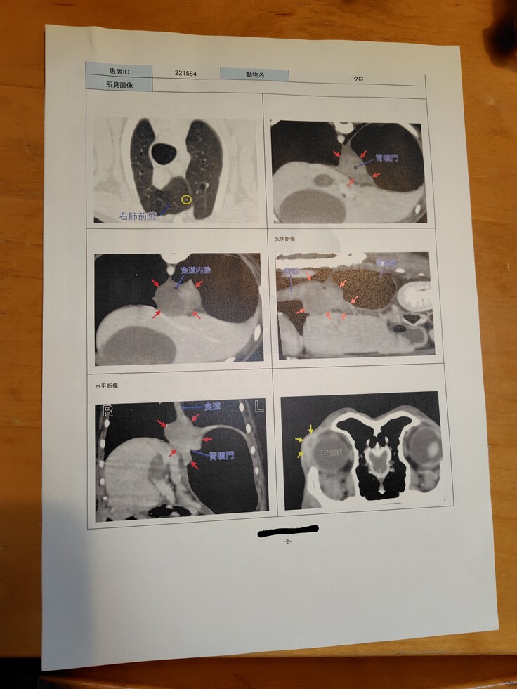 しかし、今年の3月にエサをもどしたり体調を悪くし、病院で診てもらいましたが、血液検査やエコー、レントゲンでは異常がなくわからず、とりあえず吐き気を和らげる薬を飲んでいました。しかしだんだんひどくなり、体重も16キロほどありましたが減ってきて12キロくらいになり、県外の大きい病院を紹介していただき内視鏡とCTを撮ってもらうことにしました。検査をしたのが5月7日でした。食道の外の筋肉に腫瘍が見つかりました。