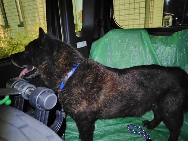 昼間は暑くて息遣いも荒く寝ていまして夕方またもどしたりしてましたが、今日は夕方早めに散歩に行き、週1回の点滴に病院に行きました。車の中ではちょっと調子良く立ってウロウロしていました。