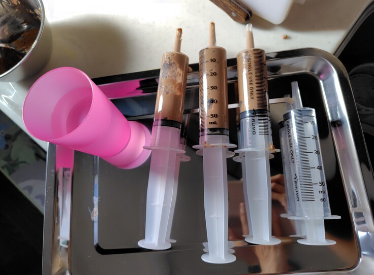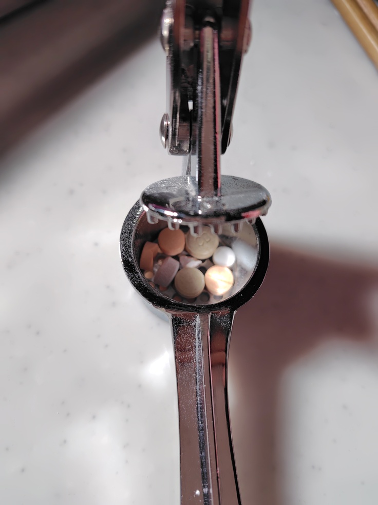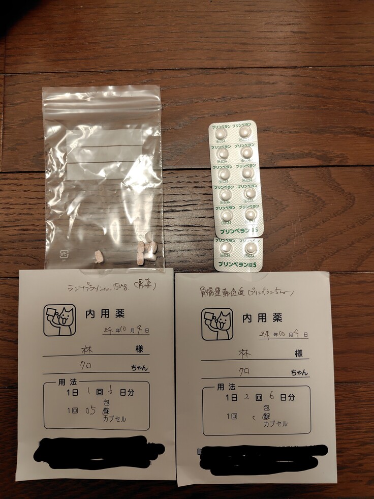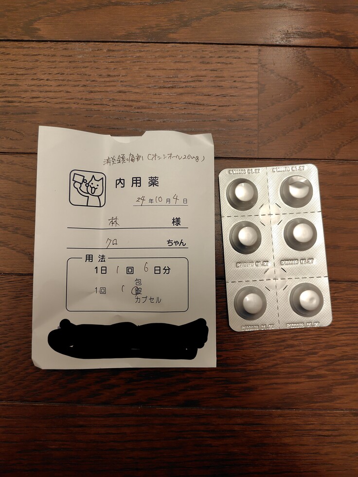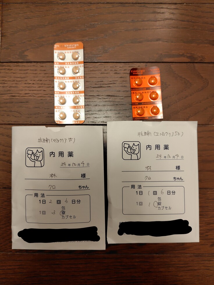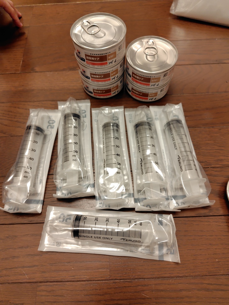 お薬は抗生剤、消炎鎮痛剤、胃腸薬をいただき、退院の日に薬剤師さんがおられないため粉にできなかったとの事で錠剤でいただきました。にんにく潰しの器具でちょうど潰せたのでお家で潰して缶詰に混ぜて、胃腸チューブを通るくらいに缶詰をお湯で柔らかくして注射器で入れます。慣れないため時間もかかります。クロちゃんはしんどいのもありますが、おとなしくじっとしていてくれて本当に有り難いです。