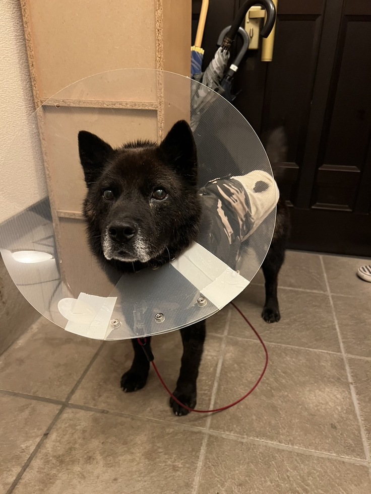 やはり少し胃瘻の所が化膿したりもあったため、患部の消毒と消毒ガーゼを交換していただき、器具も根本にもどし、エリザベスカラーをつけた方が良いとの事でつけました。