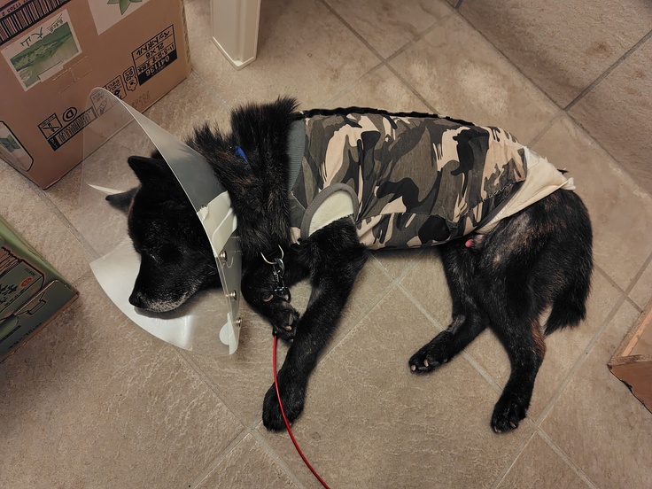 エリザベスカラーは昔尿管結石の手術でもつけてたので嫌がらずにつけてくれてます😄痛みもまだ少しあるようですし、鳴き声もまだかすれたような少し元気がありませんが少しずつ表情も良くなってきてます。便はやはり形ないようなドロっとした便ですが、毎日出ています😄