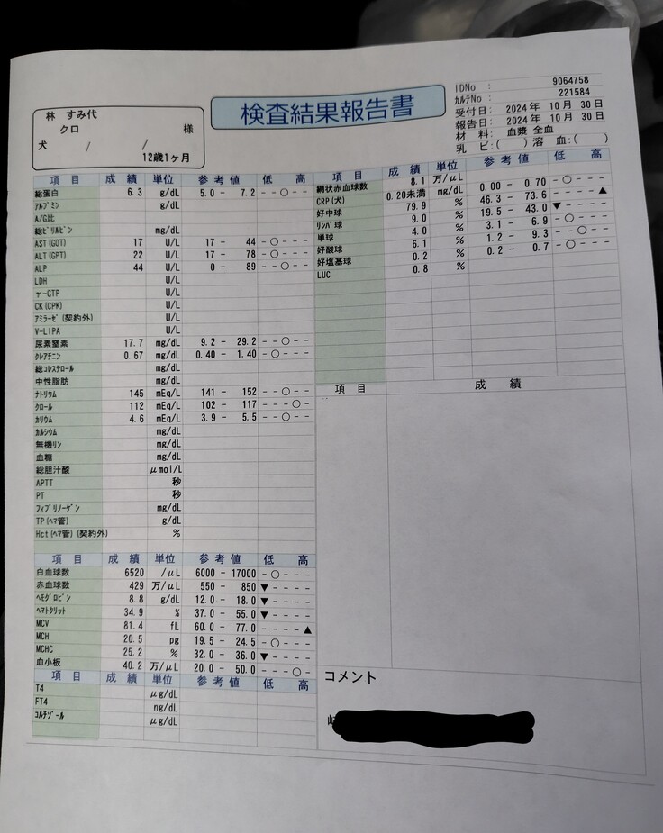 手術後の久々の血液検査をしました。貧血が少し見られましたがご飯をしっかりたくさん食べてないからかもしれないと、あまり気にならない程度との事でした。