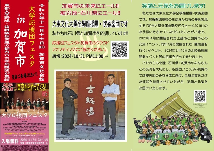 9月28日(土)に、大東文化大學全學應援團が「大学応援団フェスタin加賀市」の会場となる加賀市山代温泉にてイベントのPR活動を行います。大東文化大學全學應援團チアリーダー部4名の皆様には、9月28日より2日間にわたり開催される「山代アートマーケット」会場の山代温泉通りにおいて、大学応援団フェスタ加賀市実行委員会メンバー、石川県立大聖寺高校放送部員(本番で司会進行を務めていただきます)とともに、PRチラシ入りの「ドリップ珈琲」を500名様に無償配布する活動を行っていただく予定です。皆様、ぜひ石川県加賀市山代温泉にお越しください。