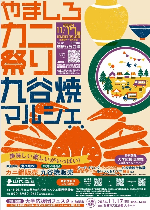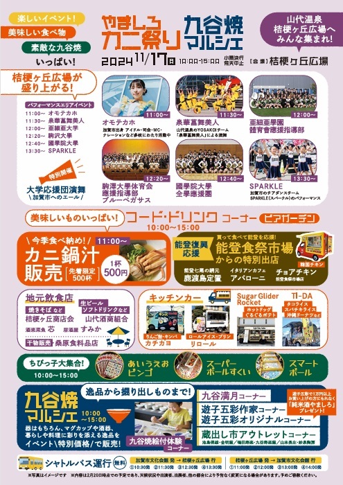 「やましろカニ祭りX九谷焼マルシェ」(主催:山代温泉観光協会)を「大学応援団フェスタin加賀市」と同日開催します。両会場間でシャトルバスを運行!ぜひご来場ください。