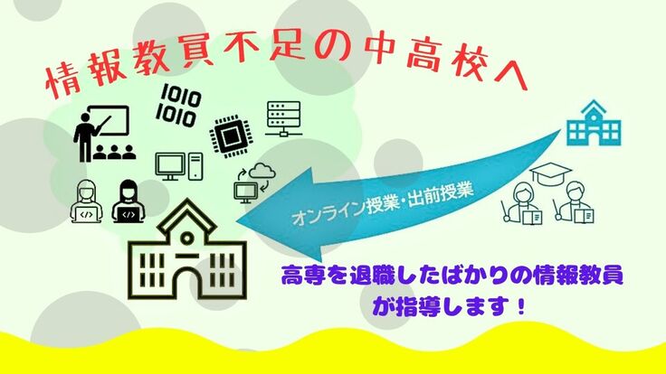 高専は、高等専門教育機関として情報を専門とする教員が63歳で定年退職します。今の63歳は健康年齢の真っ盛り、まだまだ働けます。情報系教員をリサイクルすることで、生徒さんや中学高校が直面する情報教育の問題(特に地方では教員の不足は深刻です)を解決できるのでは、と考えました。