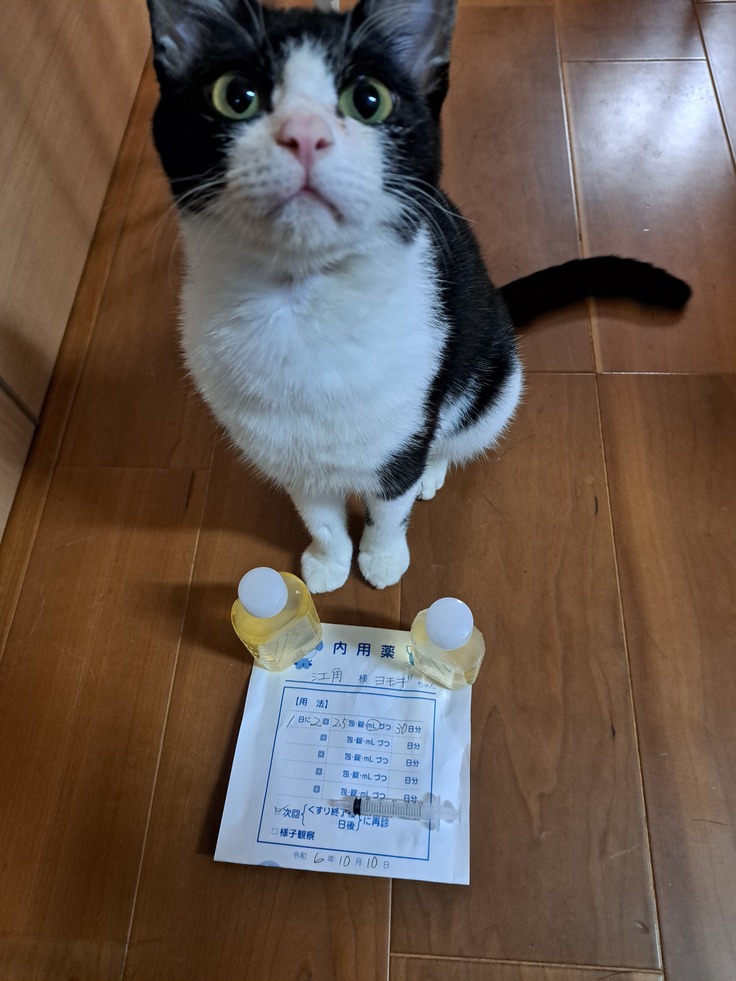 今日は病院へ行きました、よもぎは病院の薬を死ぬまで飲む必要があります。よもぎの命を繋げてくれている大事なお薬です。
