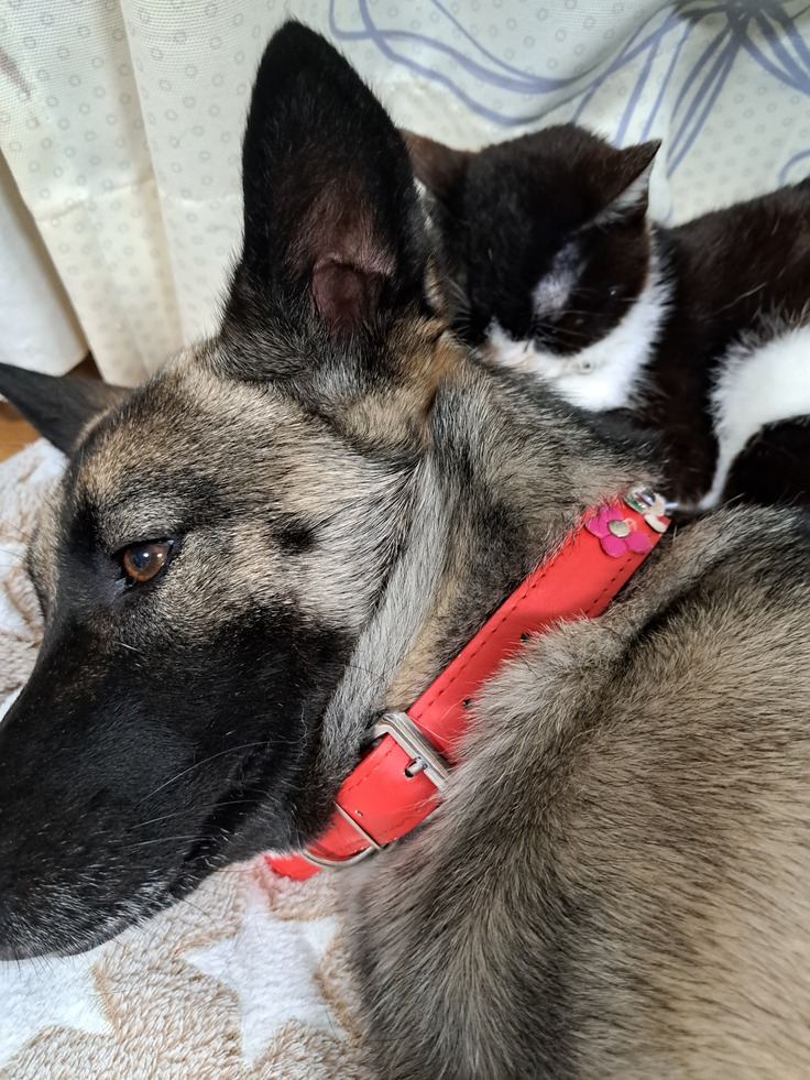 おもちはよもぎより先に家族となりました。保健所で保護された生後約2ヶ月の野犬の子供です。保健所にいき、一番始めに紹介された子を我が家の一員にしました。おもちは普通の家庭犬ではなく、野犬の子供。最初から怖がりで人に慣れず苦労しました。外に出たらパニックになり、さんぽに出れるようになるまで2年近くかかりました。外に慣れたと思ったら分離不安が始まり、予定外に外出しようものなら家を破壊、いつも出来るトイレを失敗、家族を探して遠吠えがあり、私たちも悩んでいましたがよもぎが来てからはそれがピタリとなくなりました。おもちは難しい性格でベタベタは嫌いなので舐めあったりホッコリする姿があまり見れるわけではないですが、さみしがり屋なおもちにとってよもぎはなくてはならない存在です。