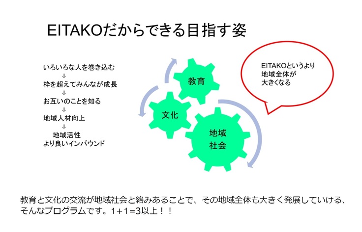 NPO法人EITAKOは、岡山県の住民や対象になる住民に対して、国際教育交流に関する事業を行い、日本文化のみならず異文化への尊敬、尊重の意識を強め、双方の人権や社会規範、倫理についての相互理解を促進させます。また、参加者に文化継承の重要さと必要性を再認識してもらうことによって、地域住民が主体となって継続的に文化継承活動を行い、地域文化の繁栄に寄与することを目的とします。