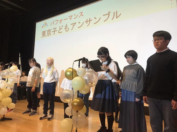 このフォーラムに携わる子どもメンバーが、「一緒に学ぼう!つくろう!広げよう!~ひとりひとりの『声』が迷子にならないように~」というメインテーマについて発表したあと、それに続いて東京子どもアンサンブルが3曲を披露しました。