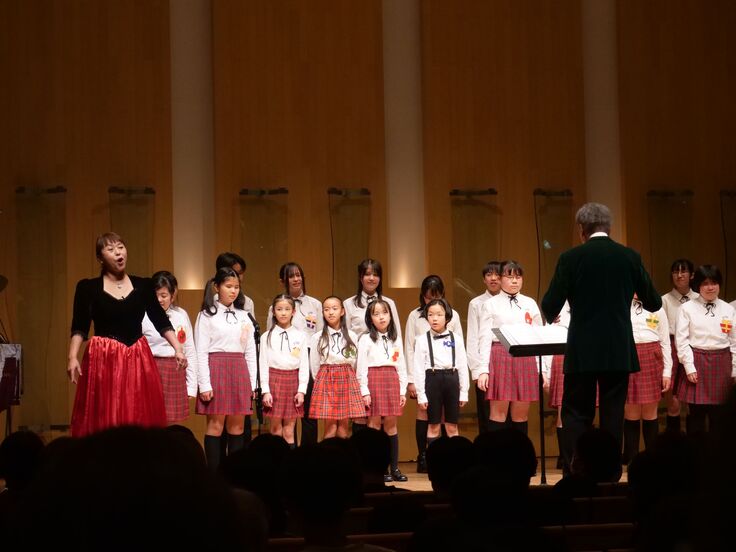 第一部は「クリスマスグリーティング」と題して、「おめでとうクリスマス」や「ステキな冬景色」など、おなじみのクリスマスの曲を子どもたちのMCとともにお送りしました。みな堂々と会場の皆さんに語りかけることができていて、歌の披露とともに、大きな自信になったようです。ソロでの歌唱もあり、緊張している子どももいましたが、それぞれによい経験を積むことができました。「ひいらぎの精」、「ホワイトクリスマス」では、日頃ご指導くださっている吉川真澄先生にも素晴らしい歌声を披露していただきました。
