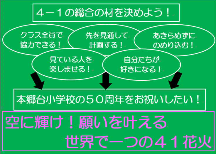 今年度の4年1組の総合的な学習の時間をどのような活動をしていくのか話し合ったときに、「クラス全員で協力できること」「自分たちがその活動を好きになること」「見ている人を楽しませたい」という視点から、「創立50周年をお祝いできる活動がしたい!」という思いをもちました。