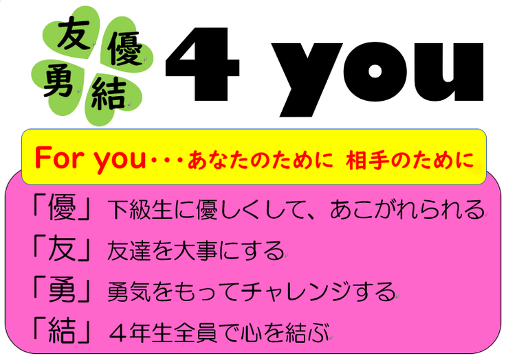 私たちは横浜市立本郷台小学校4年1組です。私たち4年1組は「🍀4you(クローバーフォーユー)」~「優」「友」「勇」「結」~という学年目標のもと、「相手のために(For you)」と4つの「ゆう」を大事にしながら、学校生活を送っています。