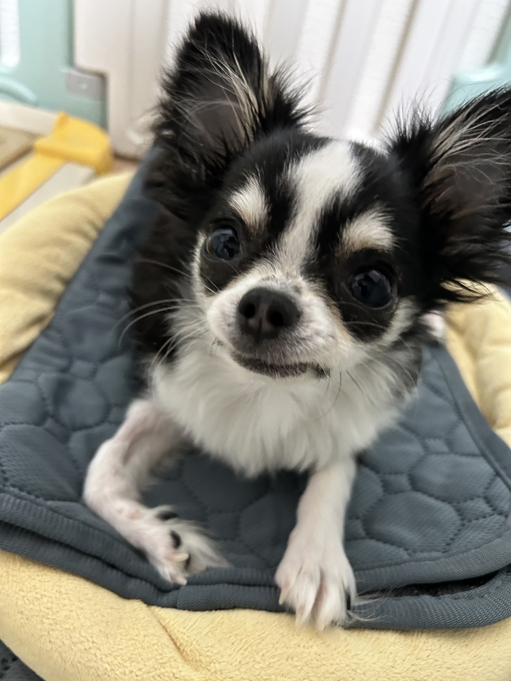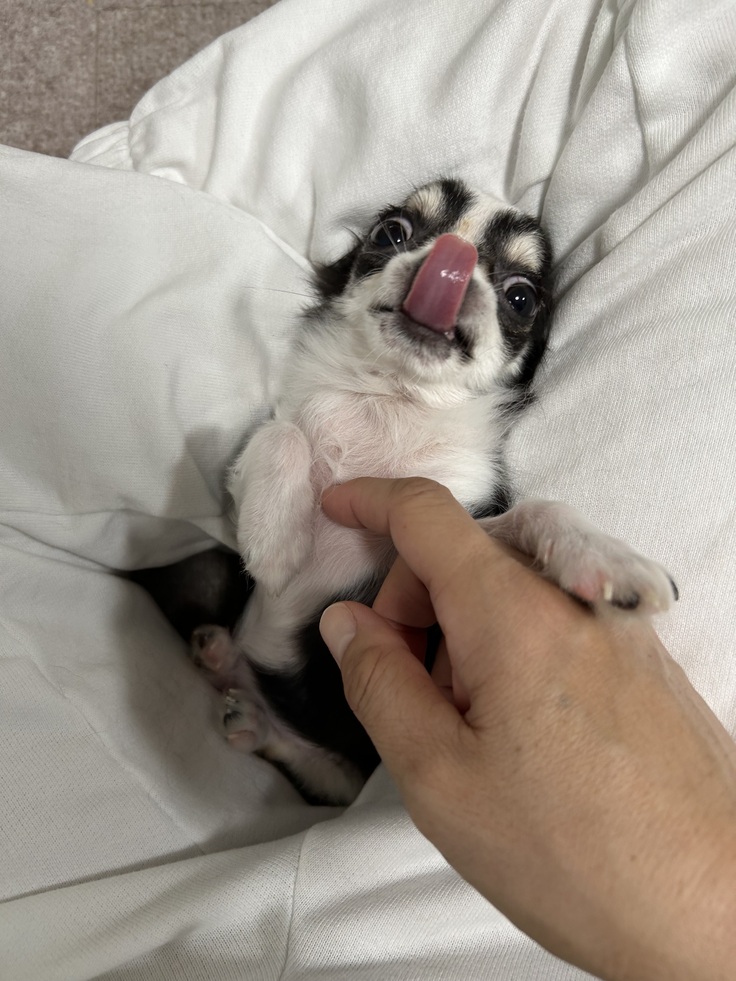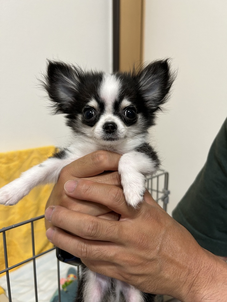 先住犬ムサシと同じ白と黒のチワワ。まだ小さな赤ちゃんでした。その日はガラス越しにみて帰宅しました。