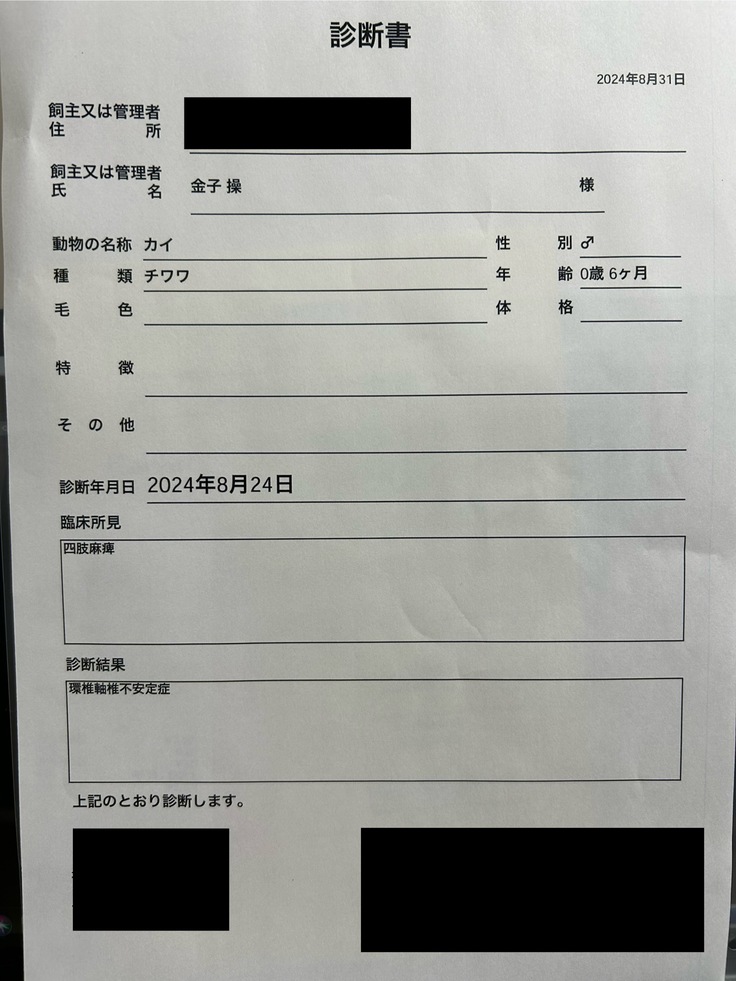 上記診断書の飼主氏名は受診したのが母なので、母の名義になっています。