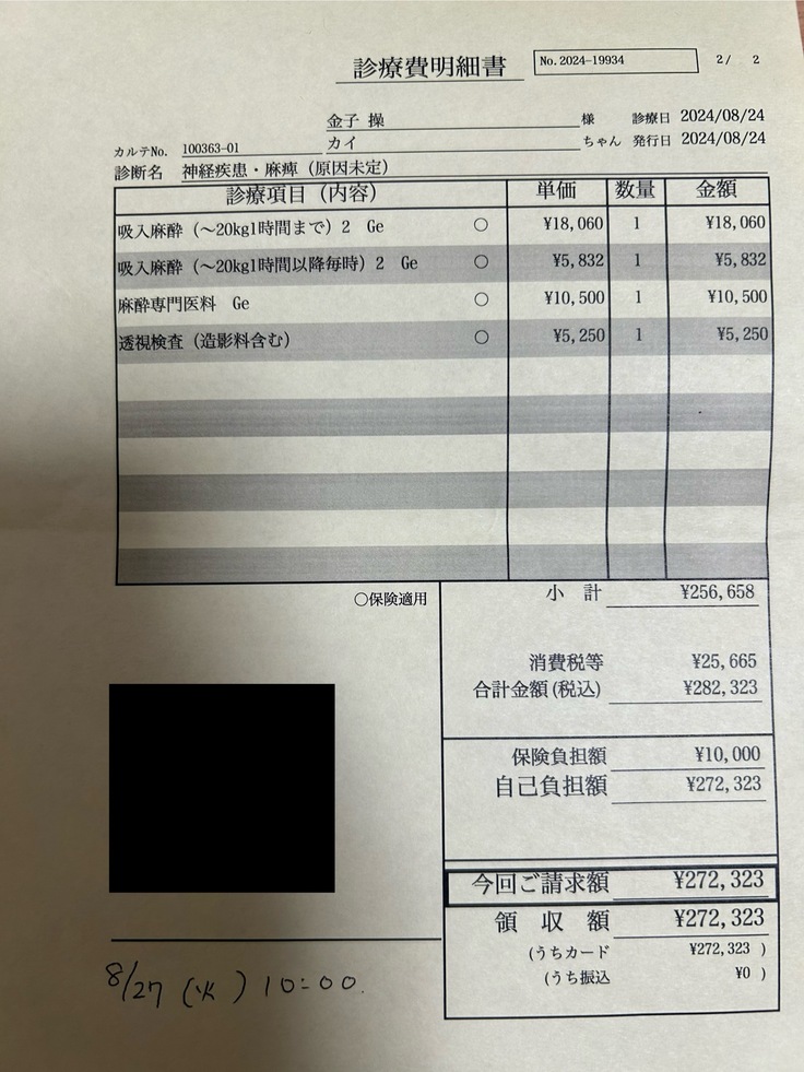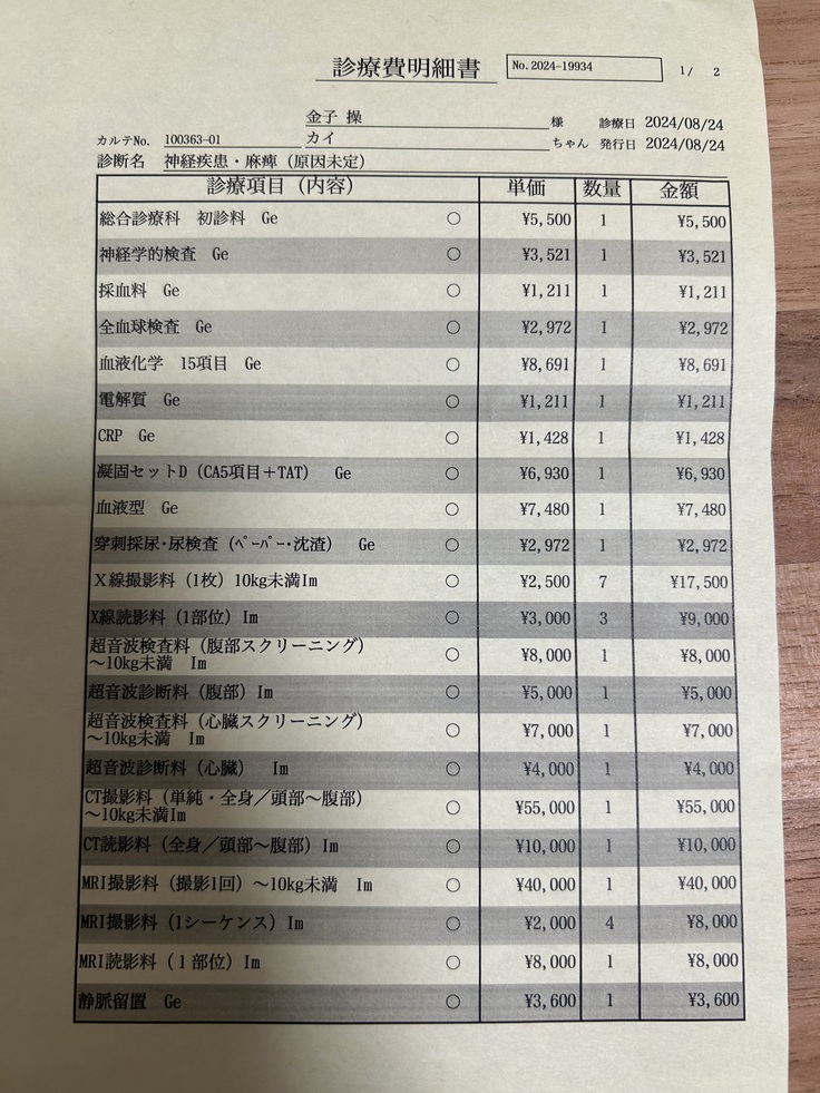 地元の病院でかかった費用(34,554円)、今後のリハビリでかかる費用、手術費の一部は自分たちで賄います。