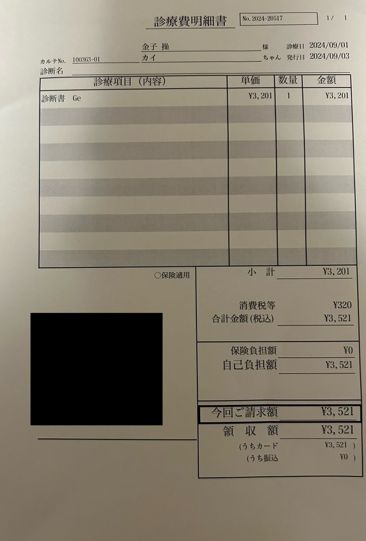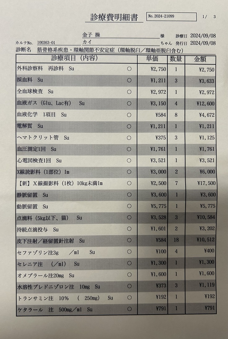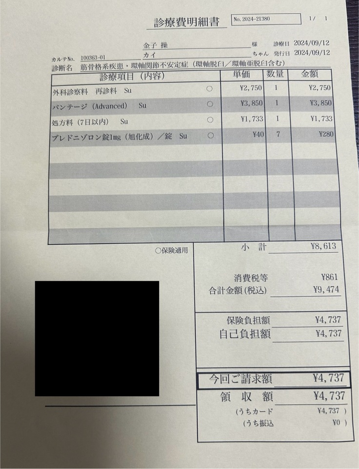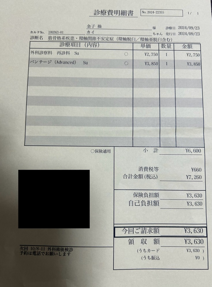 3,630円(9/23 診察、抜糸、首固定バンド)