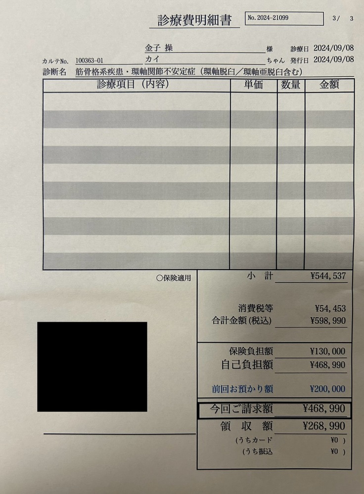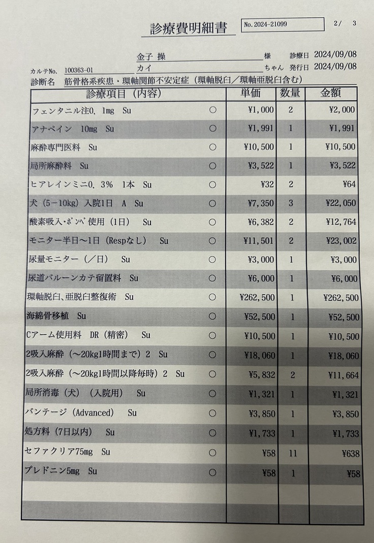 今までかかった費用は、上記費用の他に手術前の検査(MRI、CT、レントゲン等)272,323円になります。ストーリーに掲載済