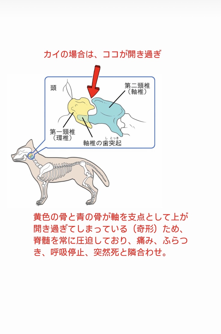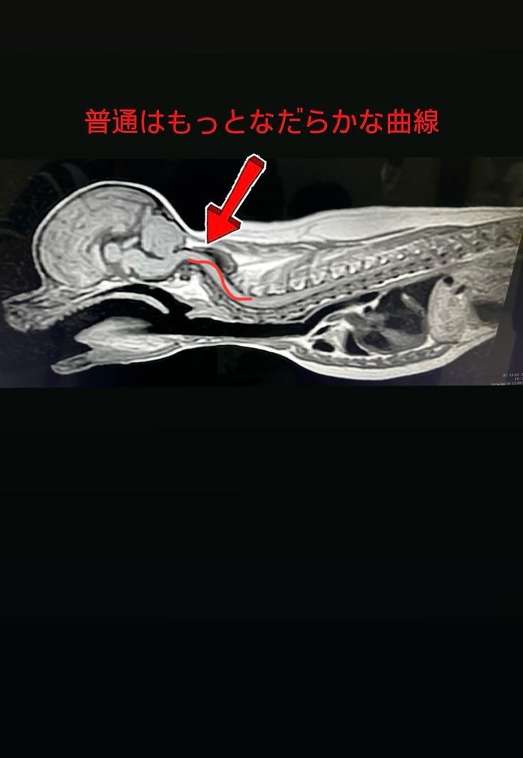 今日はあまり馴染みのない『環椎軸椎不安定症』とはどのような病気なのか、イラストと実際のカイのMRI画像を使って説明させて頂きます。