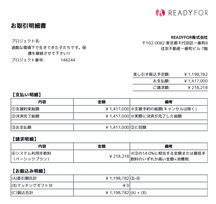 ご支援いただきました支援金が、12月10日レディフォーさんより入金になりました。