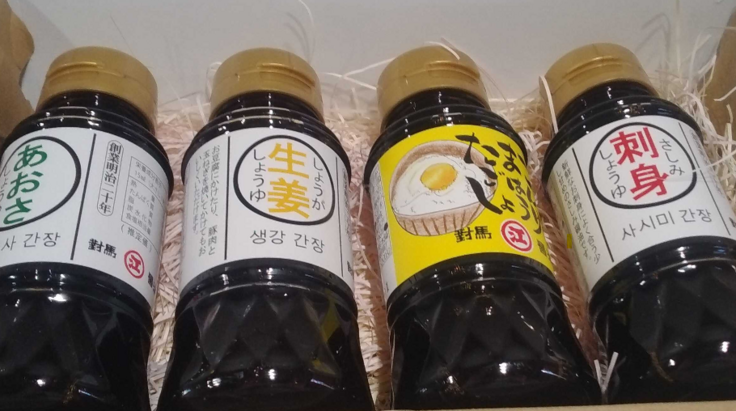 お土産に購入した対馬醤油のロゴにも韓国語が、いろんな味があり、どれもおいしいのでぜひお試しください!