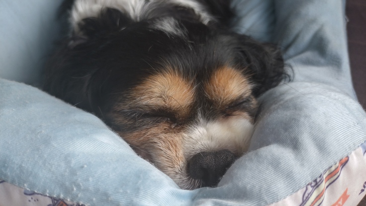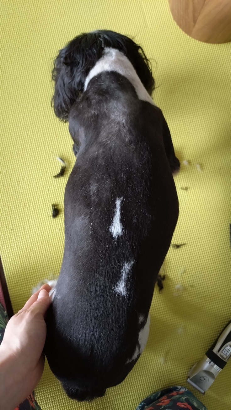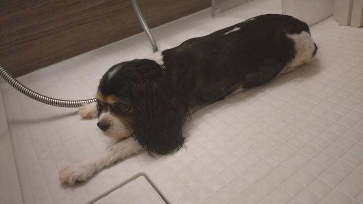朝もちゃんと起きてこれて、そんなに調子悪く無さそうだったのでシャンプーとバリカンしてあげた。負担ないようにヨガマットの上で伏せたままバリカン。