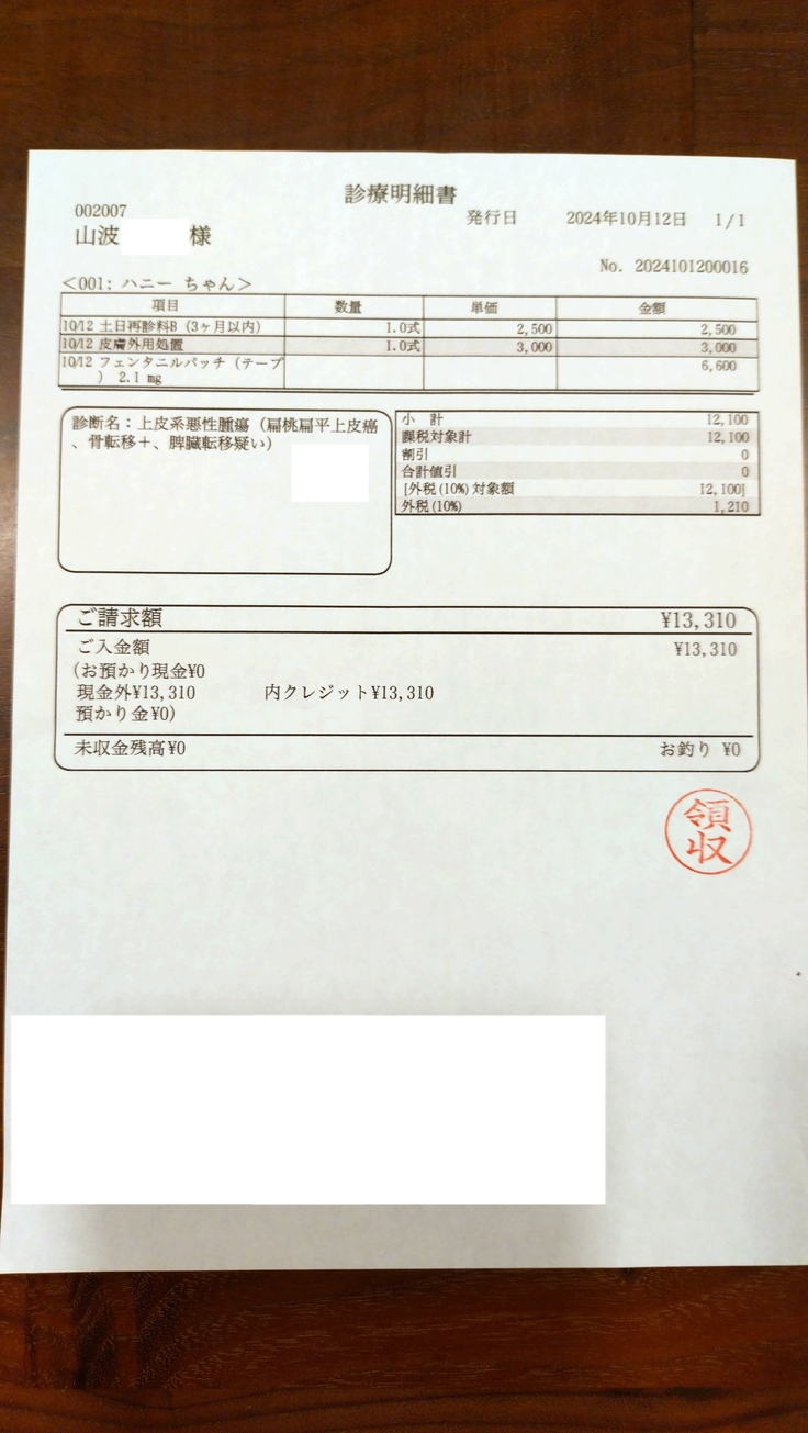 この日はハニーの足の痛みがまた出てきてしまったので、かかりつけで、疼痛緩和の麻薬のパッチを処方してもらいました。テープを貼ってるところは何だか痛々しく見えて…