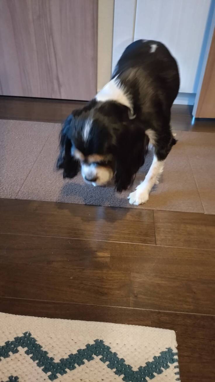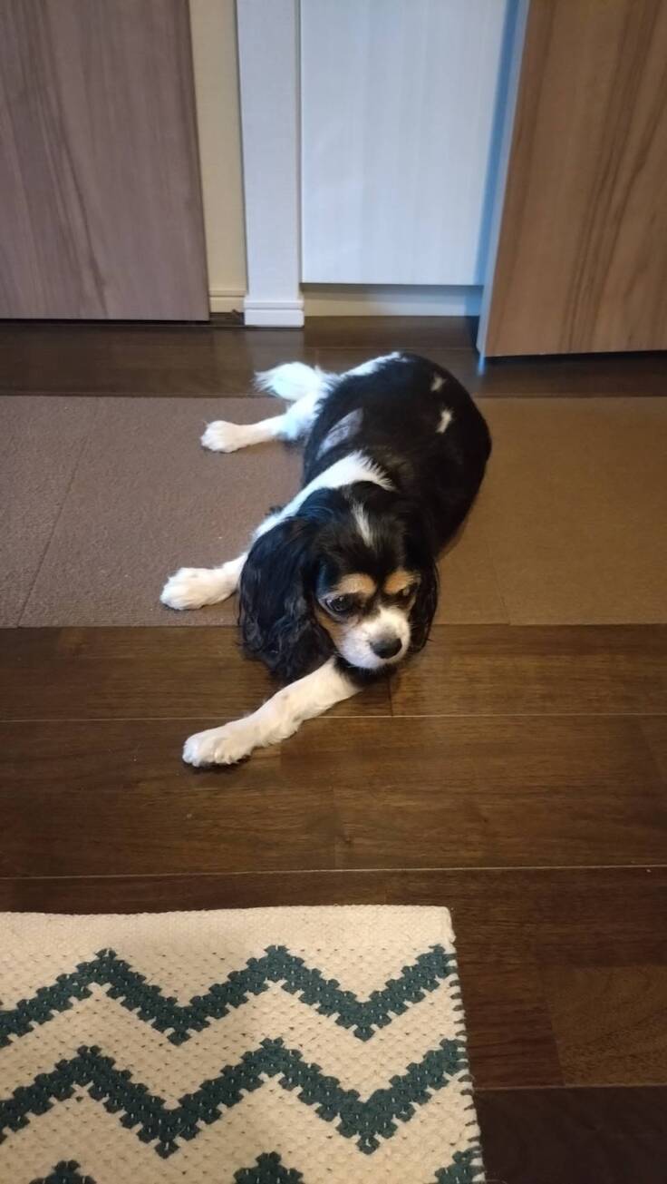 朝ごはんも用意してたら、立ち上がって、数日ぶりにキッチンの方まで歩き出す。キッチンのところで伏せながらも待ってくれてた。