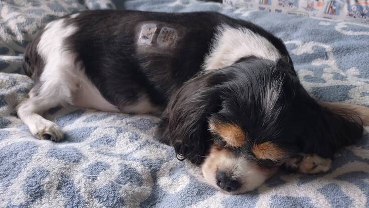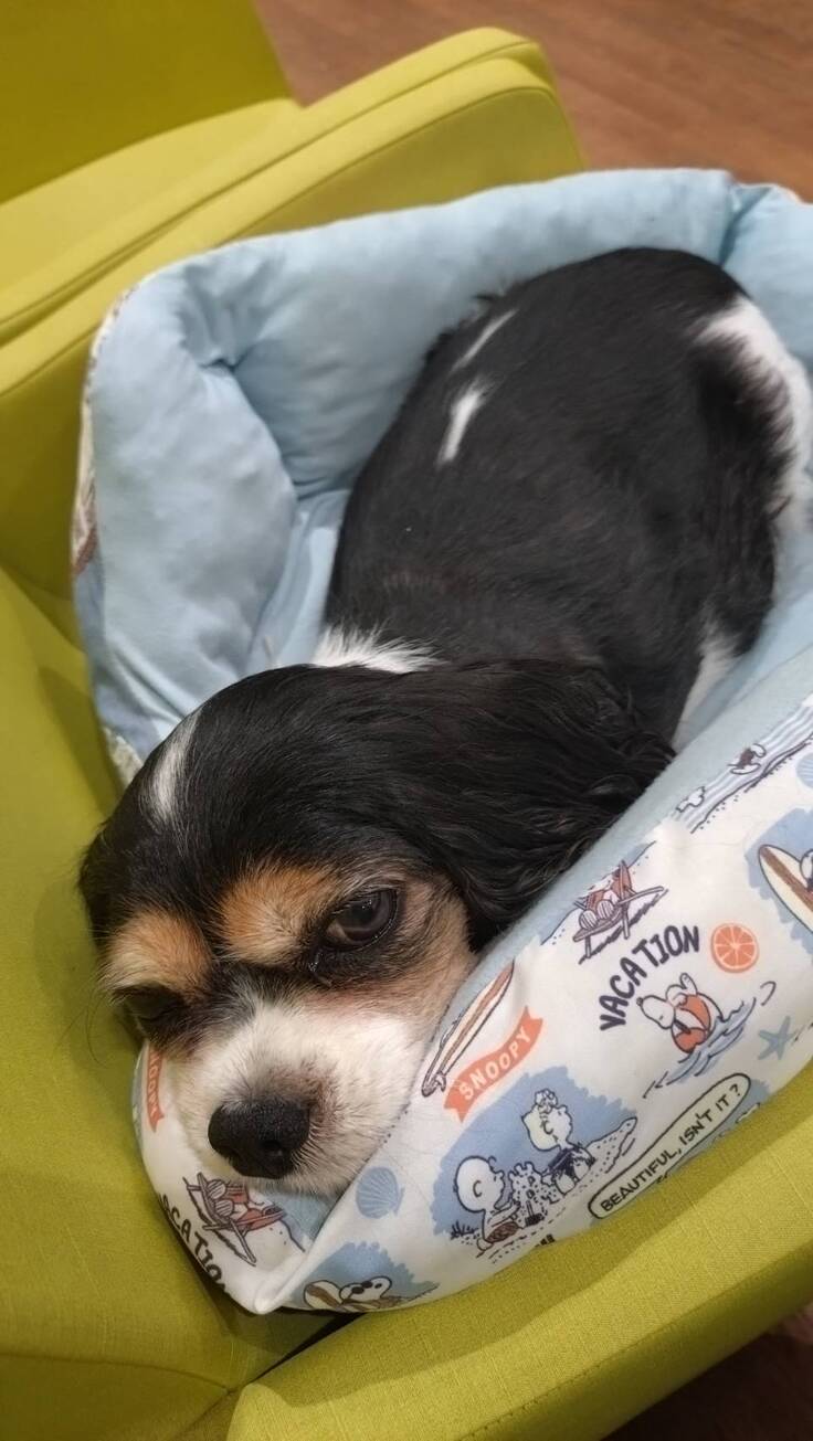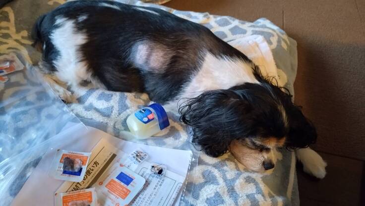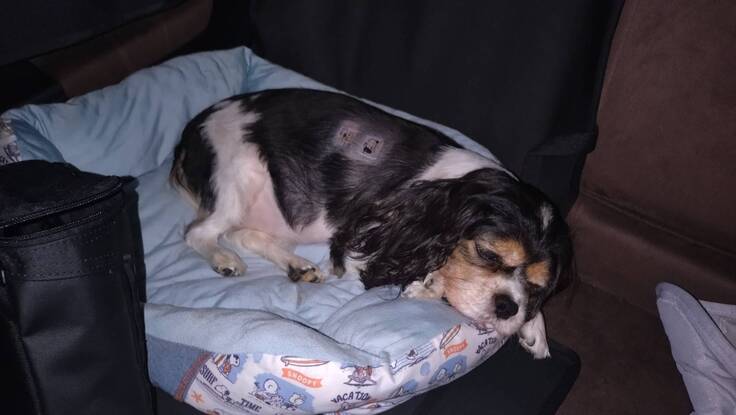 帰宅時、フェンタニルパッチと痛み止め薬が効きすぎているのか、過鎮静で爆睡…帰宅後も全く起きずご飯食べず水も飲まず薬も飲ませられてない状態…😭