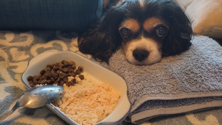 朝ごはんは身体を起こして、カリカリ、鶏むね、鯖節、カニカマ、魚肉ソーセージをちゃんとたべられた!!