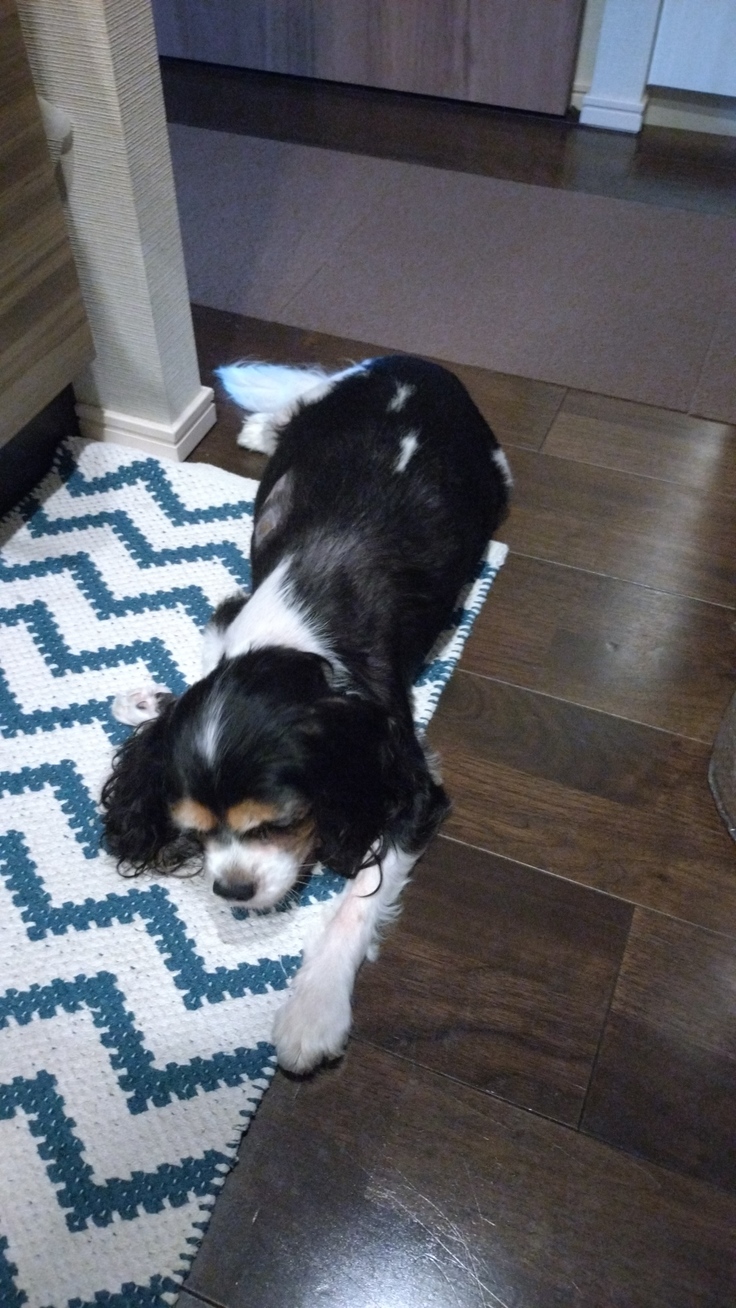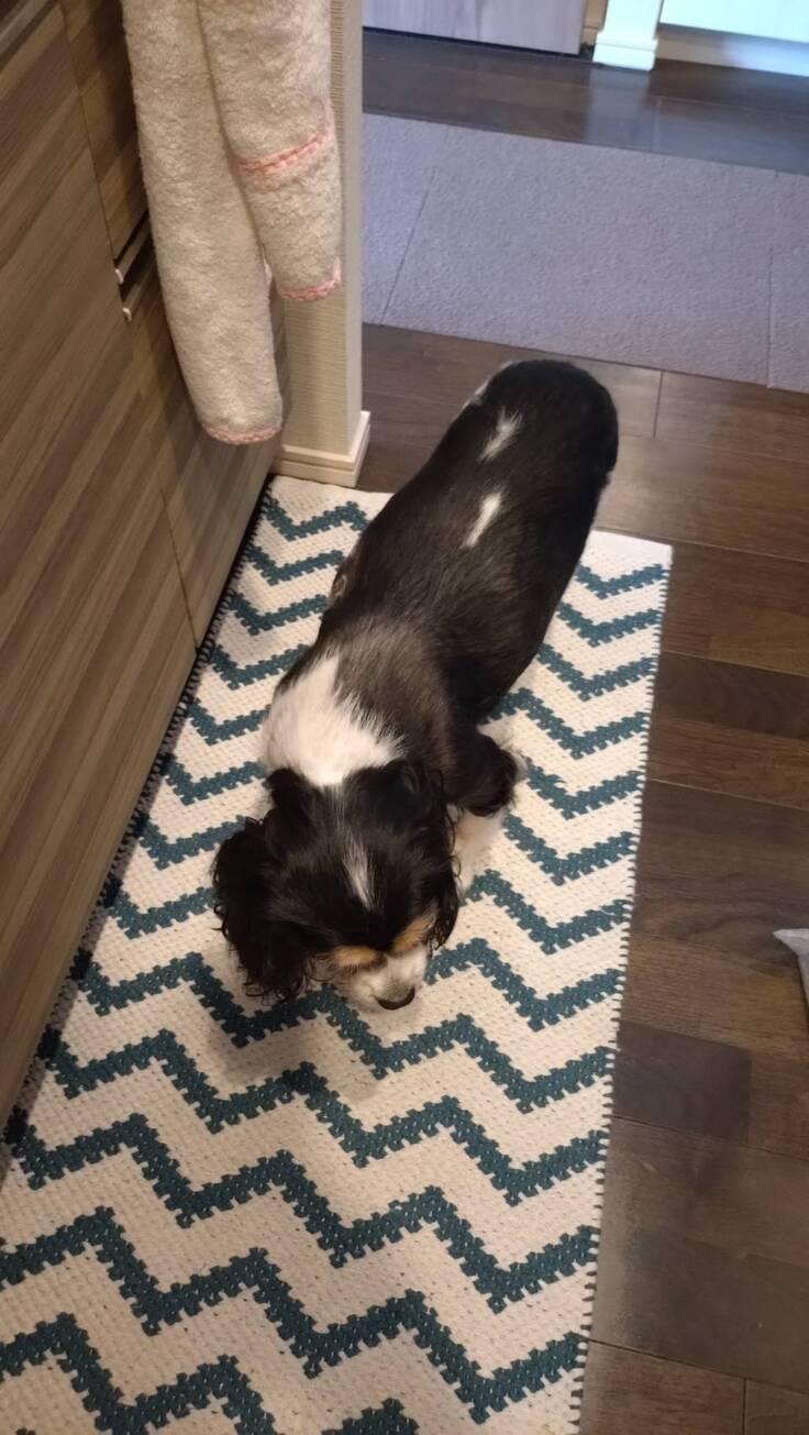 雨が降っているので、おトイレシートでおしっこ試みるも踏ん張れず3回失敗…外にも出してあげたけど、雨で濡れ、おしっこもできず…