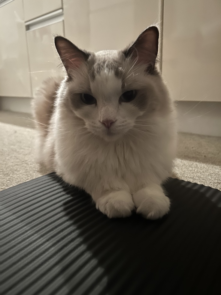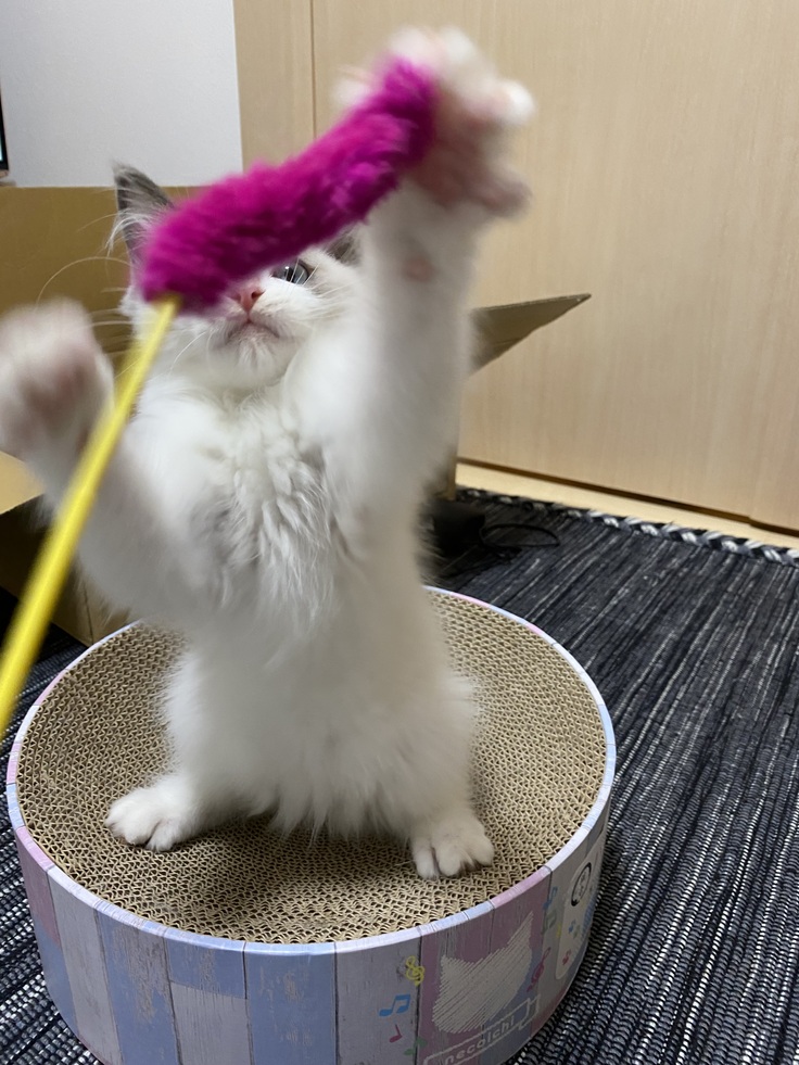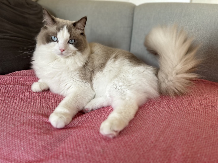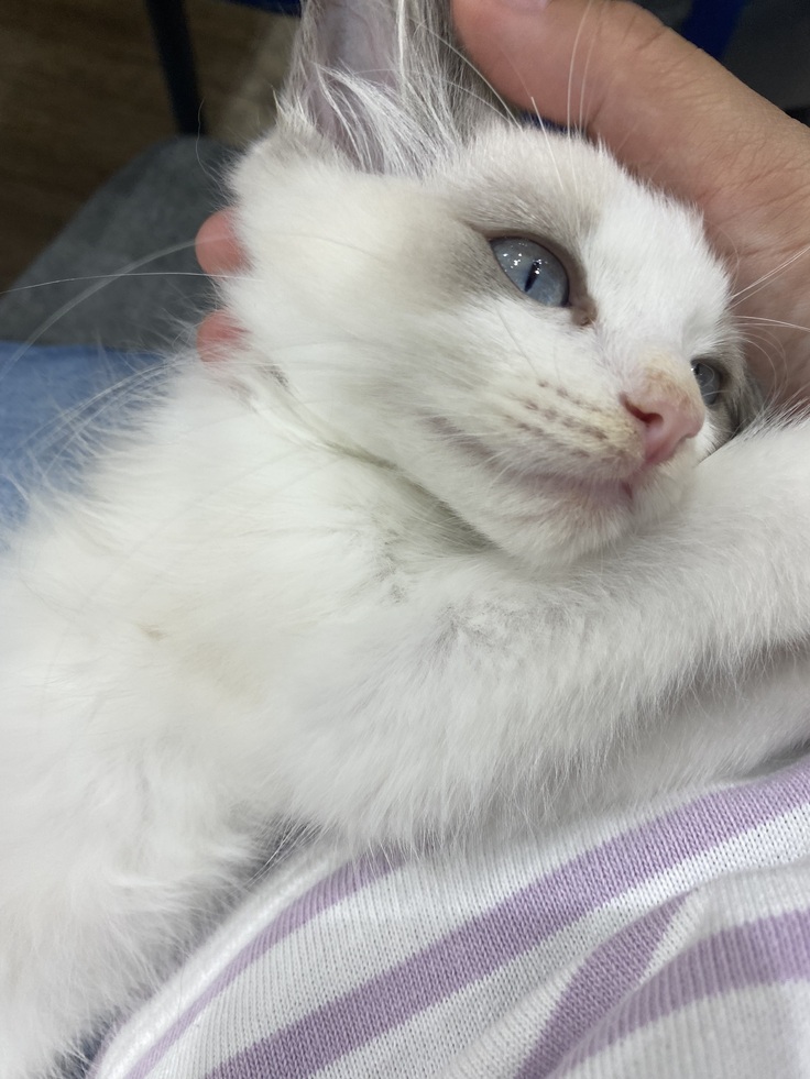 2022年10月中旬の雨の日、いつものように訪れた街のペットショップを覗いてみると、すぐにラグドールの子猫の写真が目に入りました。ですが、肝心のラグドールはいません。お店の人に尋ねると、店員さんが奥の健康管理室という名前の部屋から小さな白い子猫を連れてきてくれました。それが、私と生後3ヶ月のジャンポールとの初めての出会いでした。 私はすぐにジャンポールの美しいブルーの瞳に釘付けになり、「この子がいいな」と心の中で自分の意思が固まったのを感じました。抱っこをしてみると、ジャンポールはとても甘えた様子でこちらに体を預けて気持ちよさそうに喉をゴロゴロと鳴らしていました。私の心はすでに決まっていましたが、家族と相談する為の時間を少しいただき、家族の了承も得て正式に我が家にお迎えすることになりました。ジャンポールの誕生日は、ちょうどフランスの革命記念日と同じ日だったので、フランスの男の子の格好良い名前をつけよう…ということで、ジャンポールと名付けました。