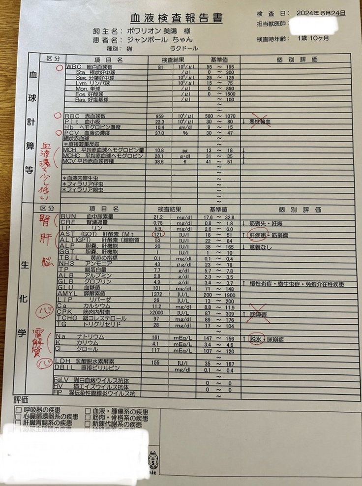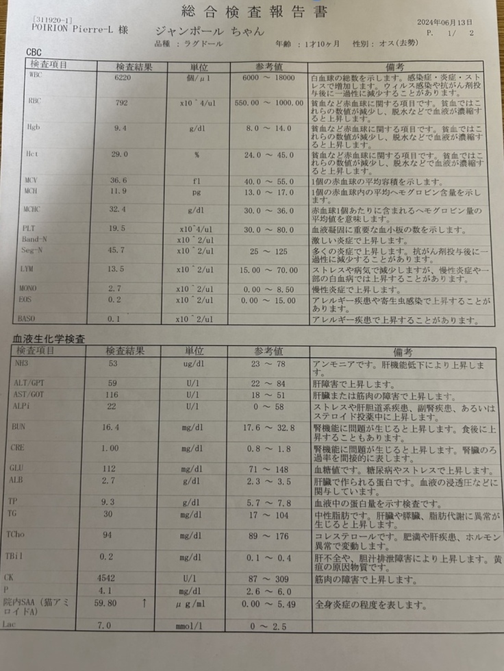 こちらがジャンポールの検査報告書です。全身炎症が非常に高くなっており、とても心配しました。