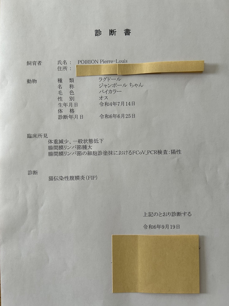 ご支援金はすべて「ジャンポールのFIP治療を行った動物病院でのセカンドオピニオン検査~FIP治療での診察代、検査代、薬代」に充てさせていただきます。