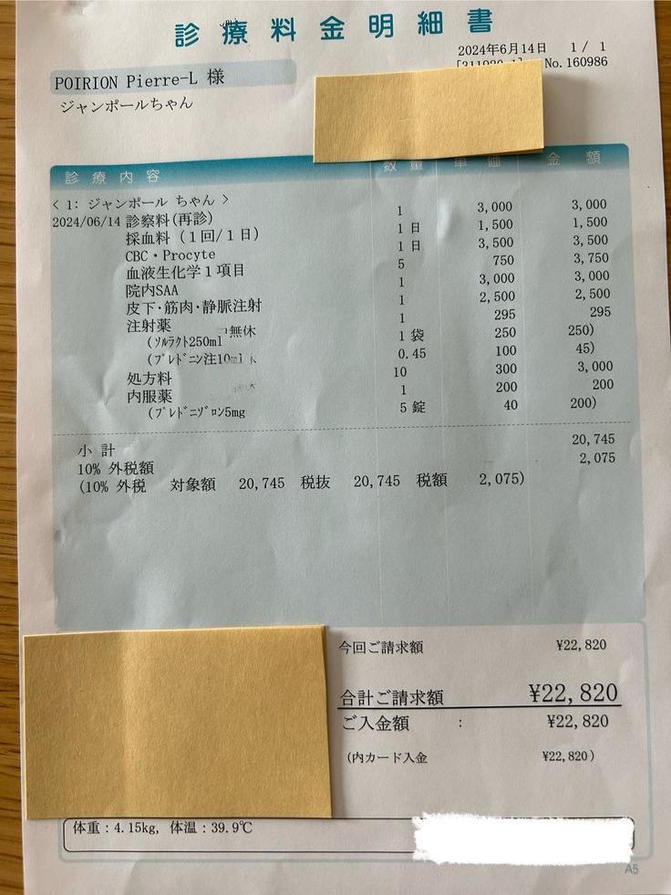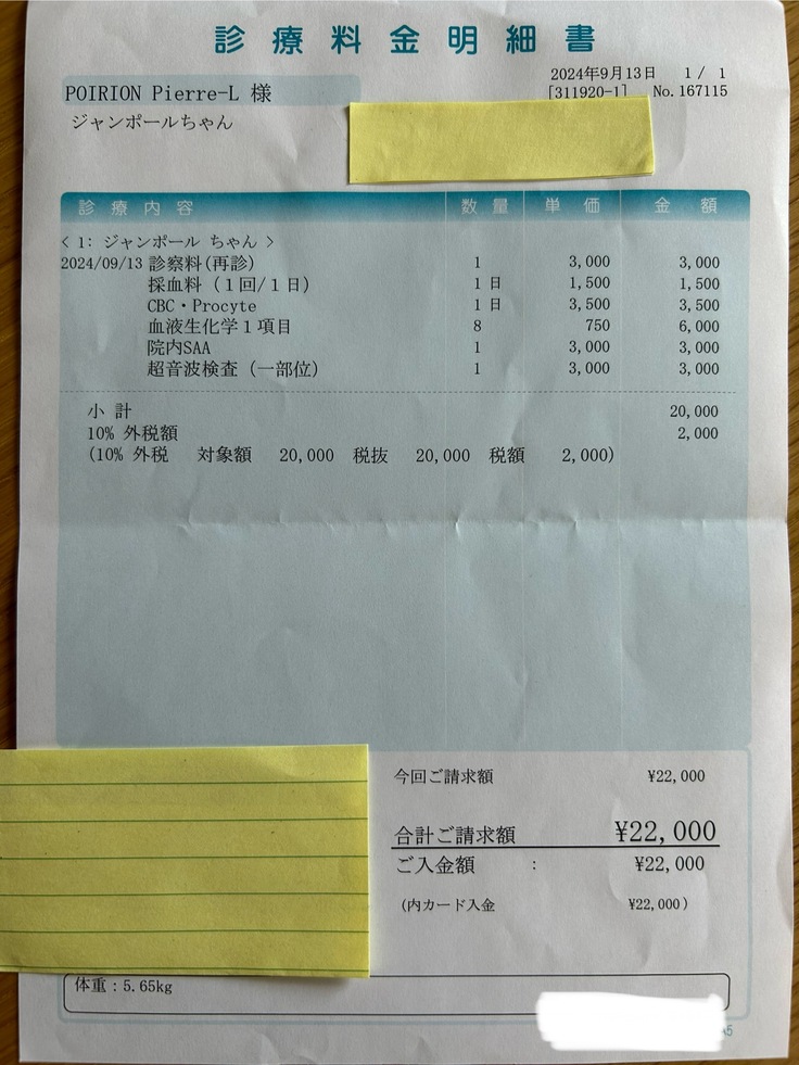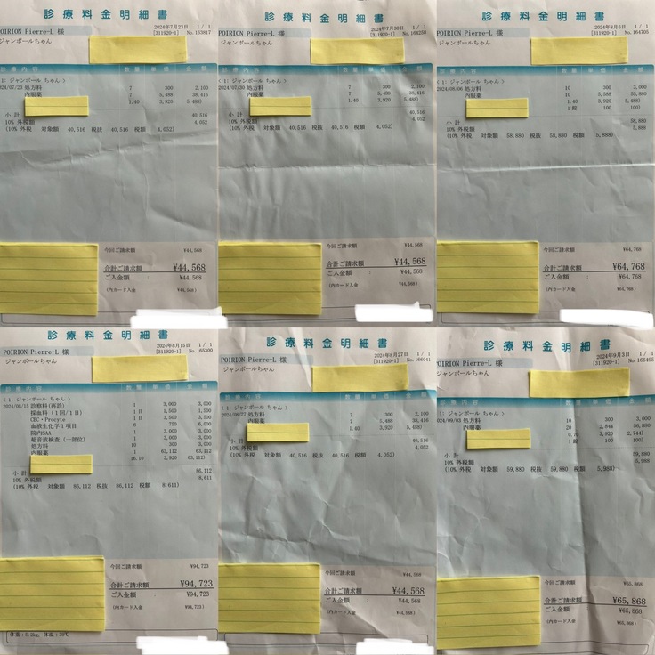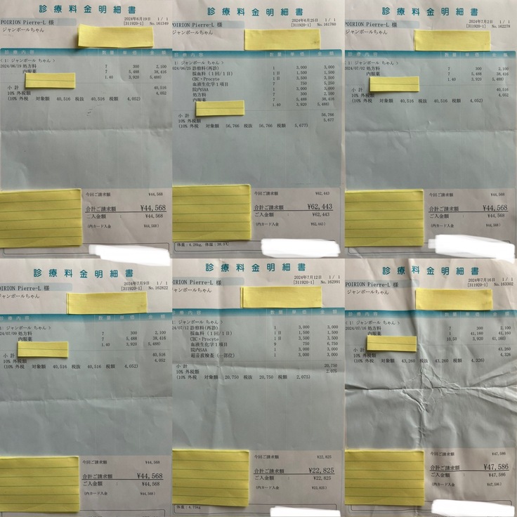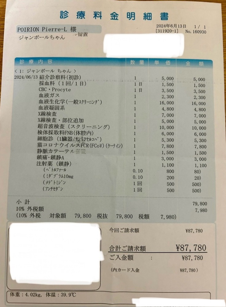 こちらが今までFIP治療にかかった診察代、検査費、お薬代の明細書です(6月19日〜9月13日)。