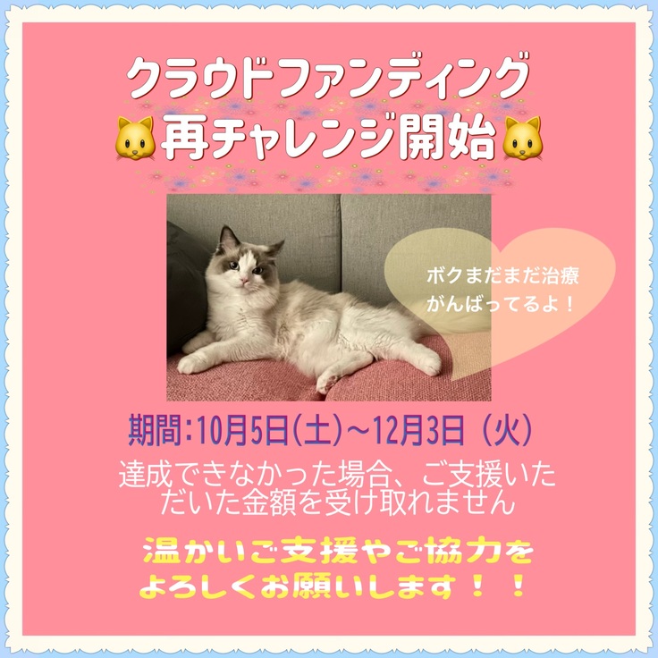 10月5日から再度、FIP(猫伝染性腹膜炎)闘病中のジャンポールの治療費の為に、クラウドファンディング再チャレンジを開始させていただきました。