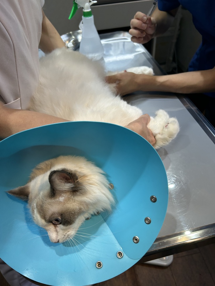採血後、麻酔入りの鎮静剤を注射して、ジャンポールには少し落ち着いてもらうことになりました。この注射がジャンポールにはとてもよく効いて、注射の10秒後には脱力して動かなくなりました。