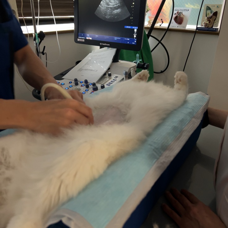 隅々までエコー画像で臓器の状態を確認してもらうジャンポール(居眠り中)