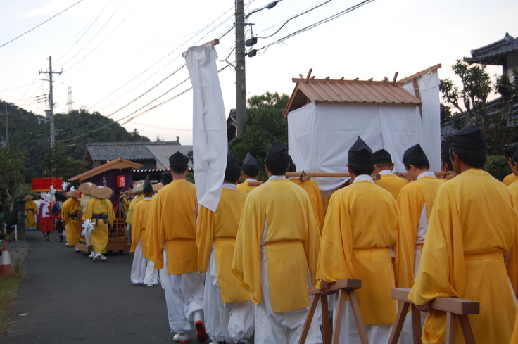 遠敷祭りの翌日、14日(火)日の入りを迎えてから、若狭彦神社の御霊(みたま)を屋根修復工事期間中、若狭姫神社にお移しする仮遷座祭が執り行われました。