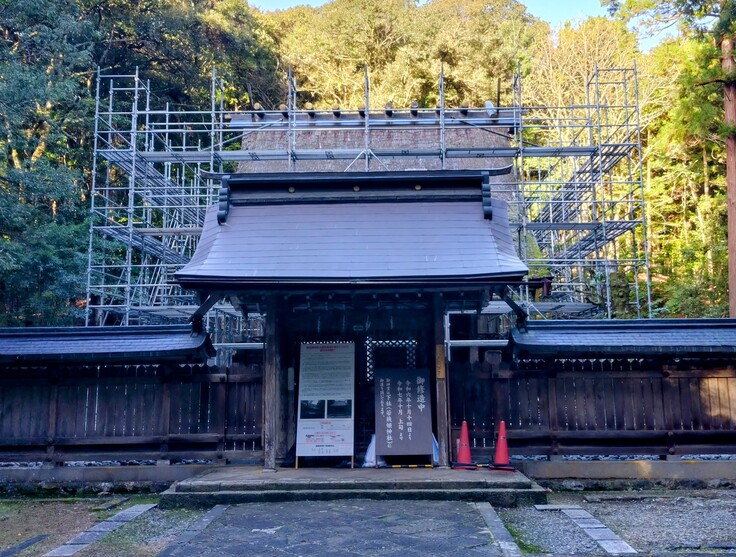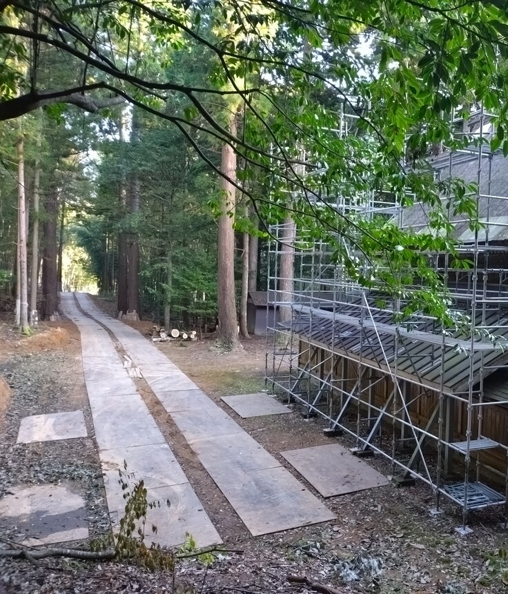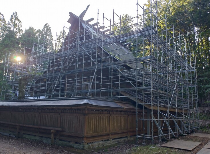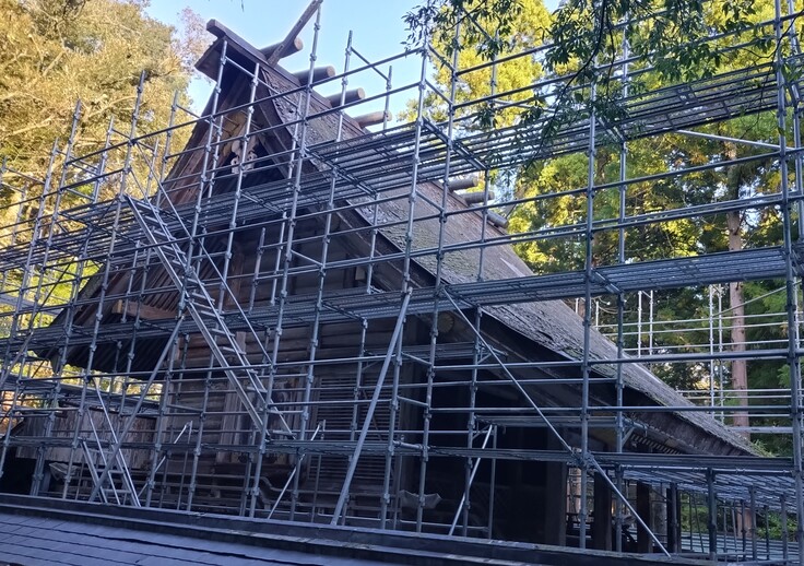 若狭彦神社本殿屋根修復工事用の足場が設置されました。