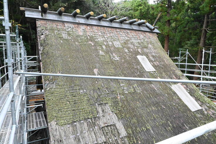 まずは、本殿を覆う素屋根の12月完成を目指します。来年1月から檜皮葺き屋根の解体に入り、その後木部の繕いや檜皮葺きの軒付きをつくります。