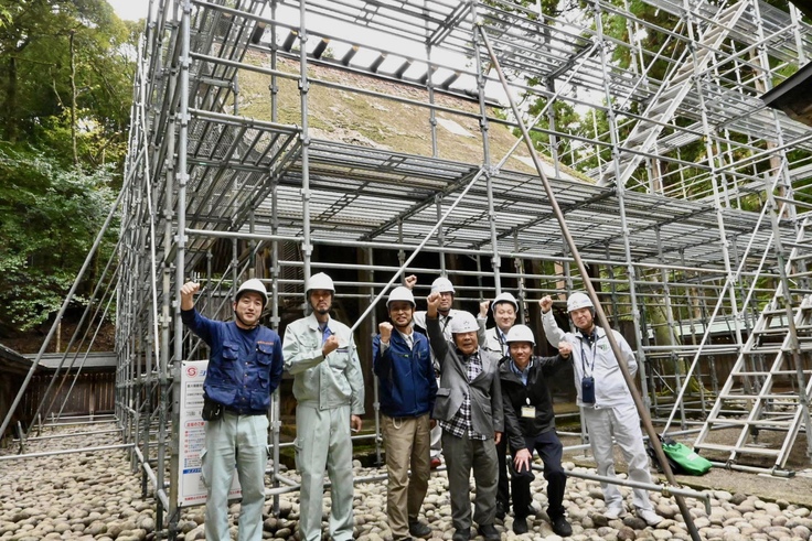 伝統的なヒノキの皮をふく檜皮葺き(ひわだぶき)の屋根であることから、施工にあたっては念入りな打ち合わせが必要となり、自然と関係者も多くなります。