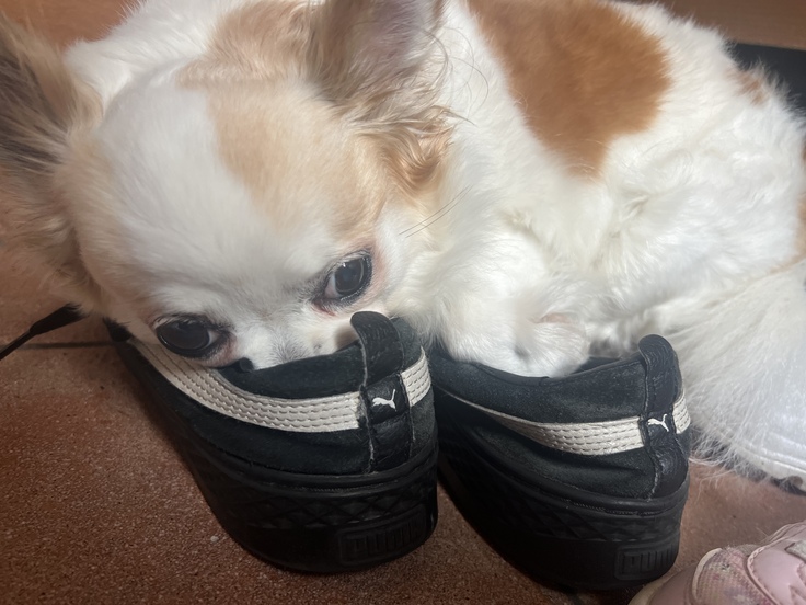 ↓りぃーちゃんは私の靴の上で寝たり、靴の中に鼻を突っ込んでいます。