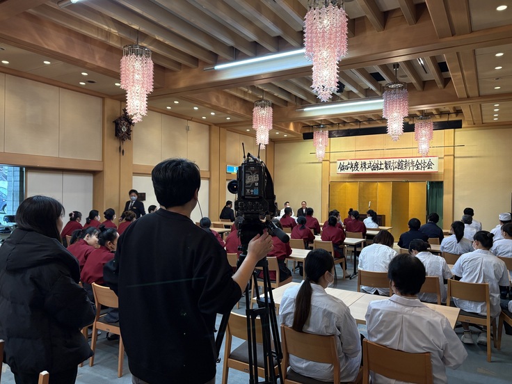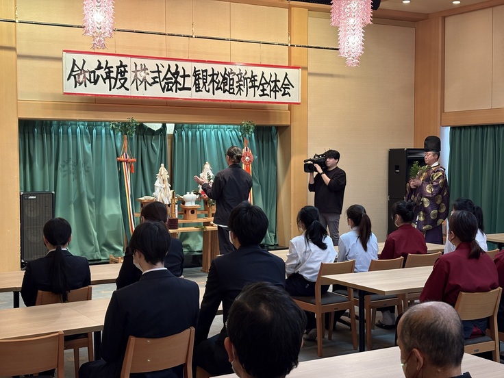 当館でも年末明けの1月6日に新年全体会、商売繁盛・社運降昌を祈願して地元神主よりご祈祷をして頂きました。全体会では弊社社長より、豪雨災害の復旧作業の労いの言葉、再出発出来た事のお礼のあいさつを頂戴し、全社員で会社を盛り上げて行こうと、新たなスタートを誓い合いました!