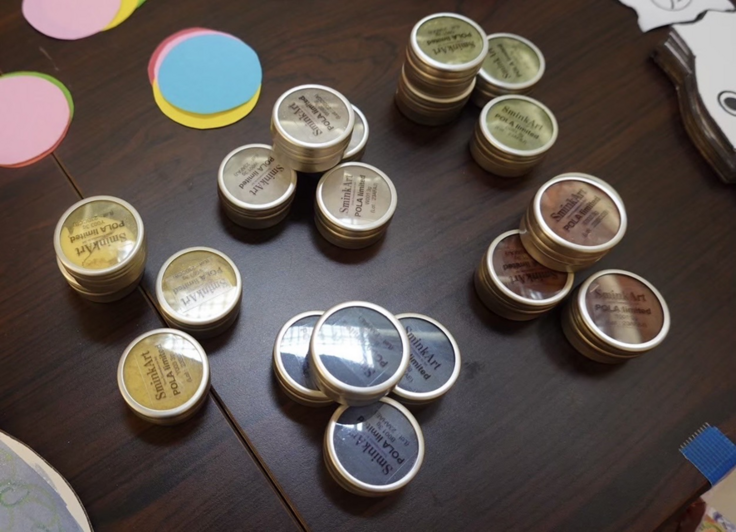 石川県珠洲市にて、復興支援を行っている宮口智美さんのご協力のもと、本町ステーションにて、親子を対象としたワークショップを行います(イベント型支援)。ワークショップでは、第一弾として12月に、クリスマスを迎えることから「スノードーム」を作ります。それに加えて、ソルトペイントで「Thanks カード」も作る予定です。子どもたちが制作したスノードームとThanksカードは、制作後、自宅や避難施設に持ち帰って飾っていただき、ワークショップの思い出になることを願っています。具体的内容については、当日のチラシを参照ください。また、本ワークショップにて使用する絵の具は、化粧品やスキンケア用品を扱う株式会社ポーラさんからの提供になります。ポーラさんでは、SDGsの一環として、使わなくなったメーク用品を絵具に変え、再利用する取り組みを行なっています。この絵の具を水に溶かし着色すると、光の具合によって、細かく輝くラメが特徴になります。詳細は、下記の写真をご覧ください。