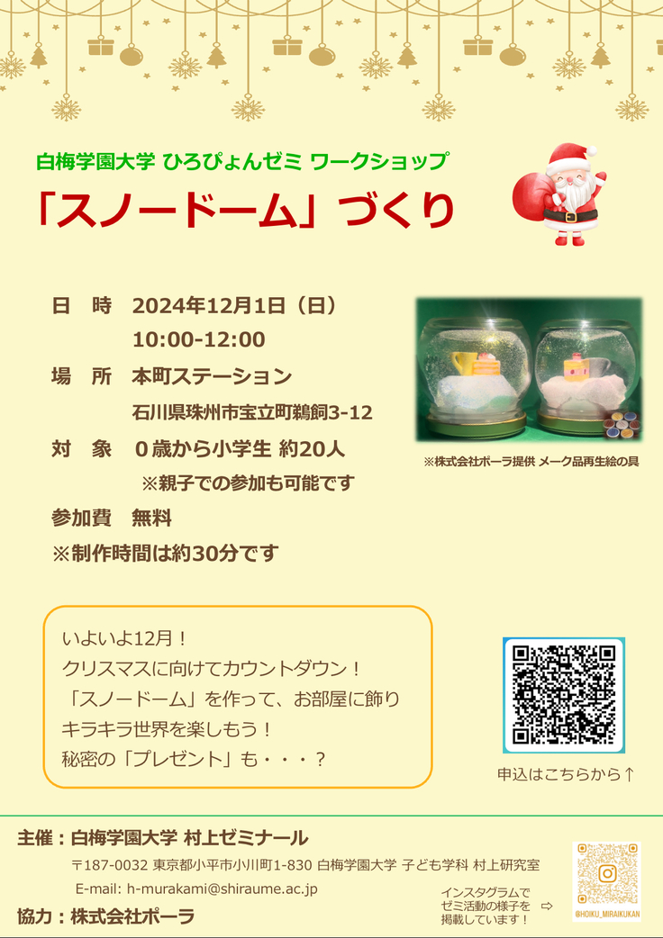 私たちは東京都小平市にある白梅学園大学村上ゼミに所属し、保育者等を目指して日々、子どもや保育について学んでいる学生です。本ゼミでは、未来を担う子どもたちに、笑顔で楽しく、子ども時代を自分らしく過ごしてほしいという願いのも、「子どもと保育の未来空間」(Instagram:@hoiku_miraikukan)というプロジェクトを立ち上げ、これまで様々な活動を行ってきました。
