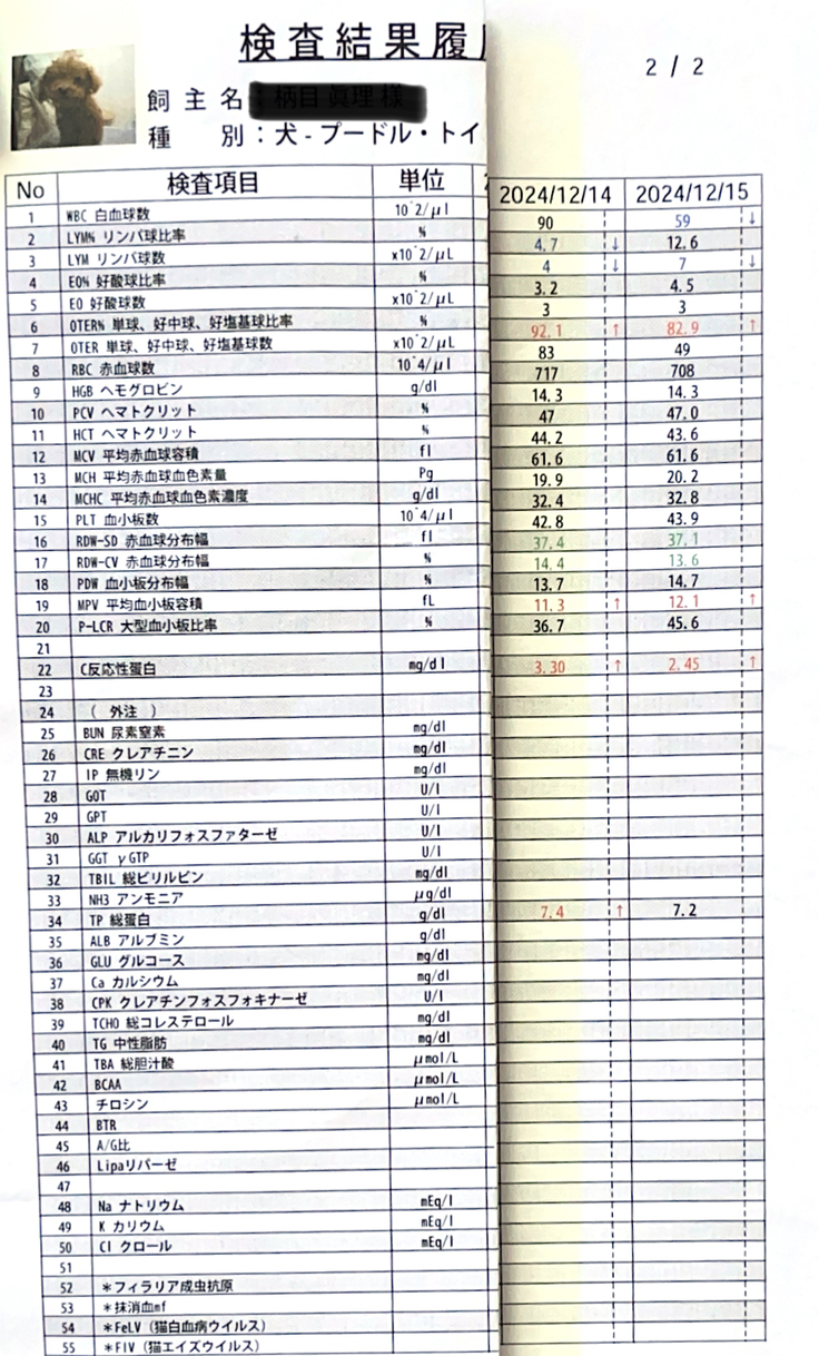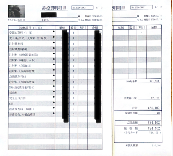 化学療法は抗がん剤の投与、体力の回復や副作用を抑えるための注射や点滴、体の様子を知るための血液検査、飲み薬などを併用していきます。抗がん剤投与の日は4〜5万円超程度、それ以外の日でも2万円前後、血液検査の内容によっては3万円以上が1回の診療でかかってきます。副作用が強く出てしまい、まめ丸の体調が崩れてしまうと、連日の点滴と血液検査がおこなわれ、高額な費用がかかってきます。
