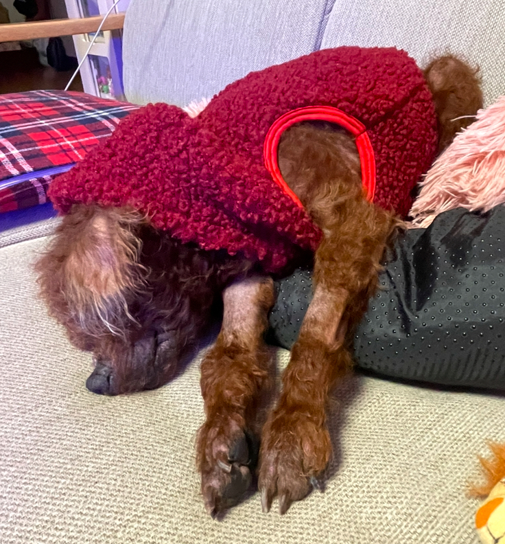 まめ丸は今日は一日中病院で、抗がん剤あとの点滴治療をしてきました。昨日苦労して入れた針は、今日まで何とか持ち堪えてくれたようです。頻繁に体勢を整えないと、点滴が漏れてしまう危険があったようで、針は外しての帰宅となりました。カラーがとれ、本人はスッキリした様子ですが、金曜に再び、針を入れなければなりません。