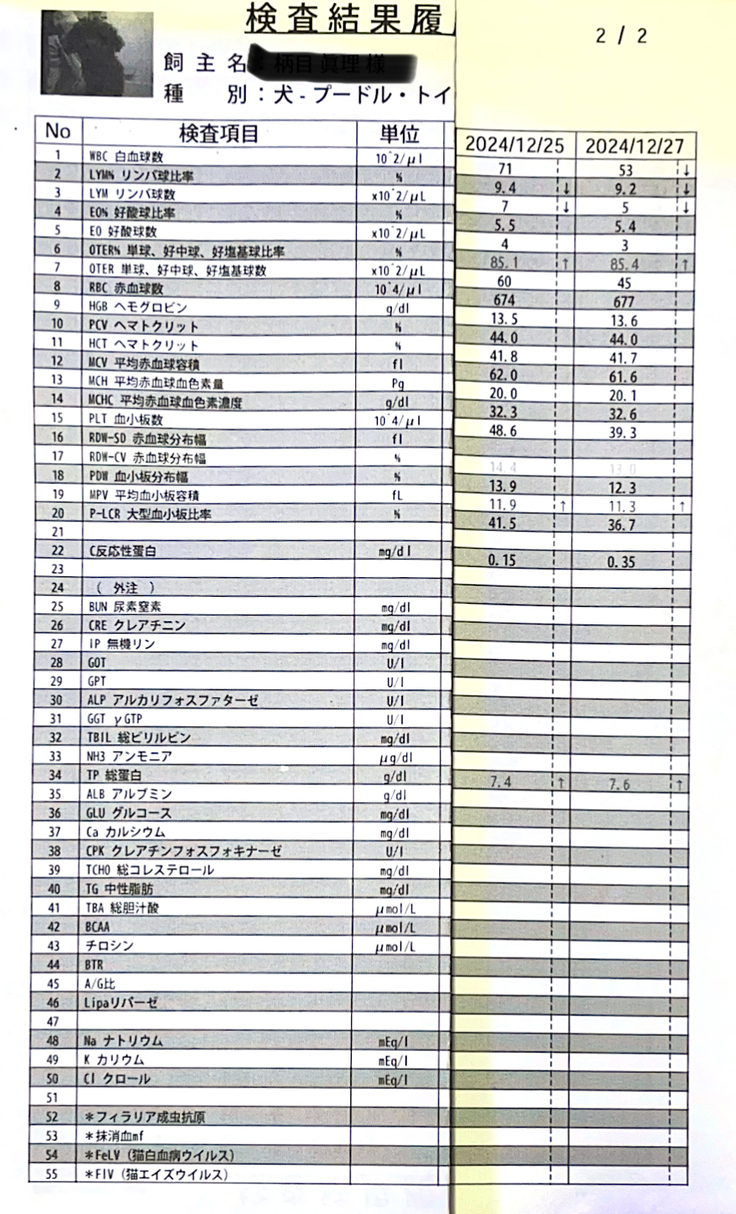 血液検査の結果は、全体的に良くない方に動きがありましたが、抗がん剤の副作用が出てきたのだと思われます。