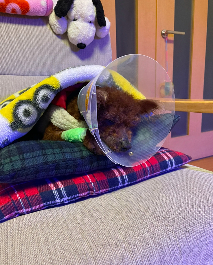 体調は、昨日朝は食欲があまりなかったのですが、今日はだいぶ食べるようになってきました。1日病院にお預かりだったので、疲れてしまい、今はぐっすり寝ています。